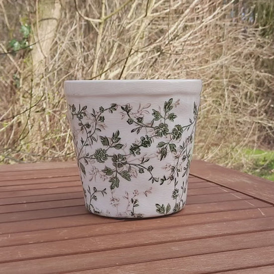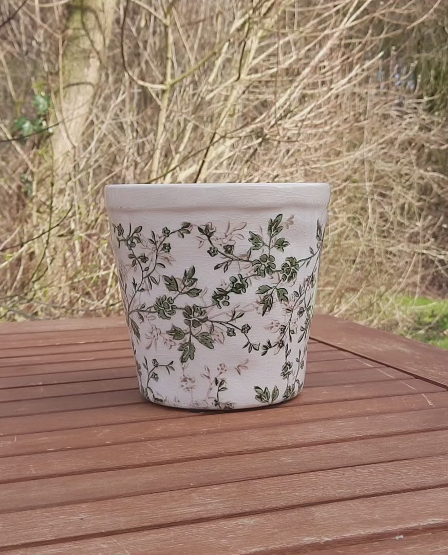 Blumentopf / Übertopf aus Keramik in Grün-Beige für Innen mit Rankenmotiv