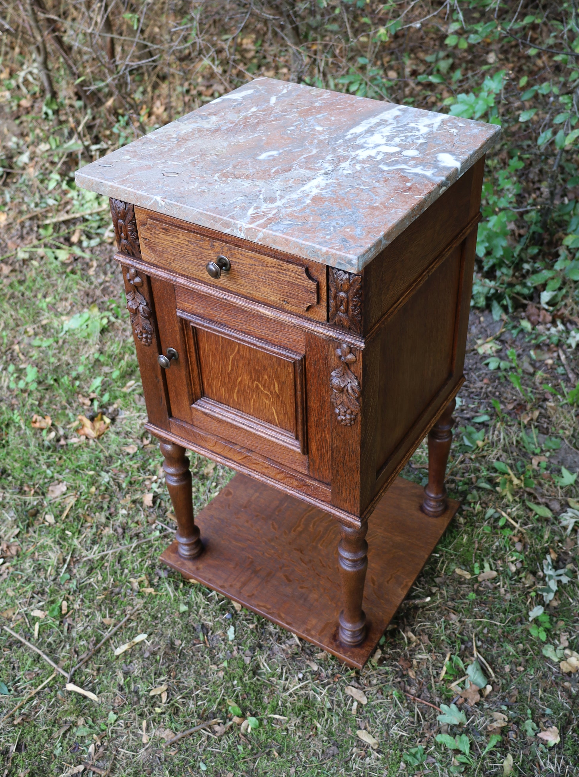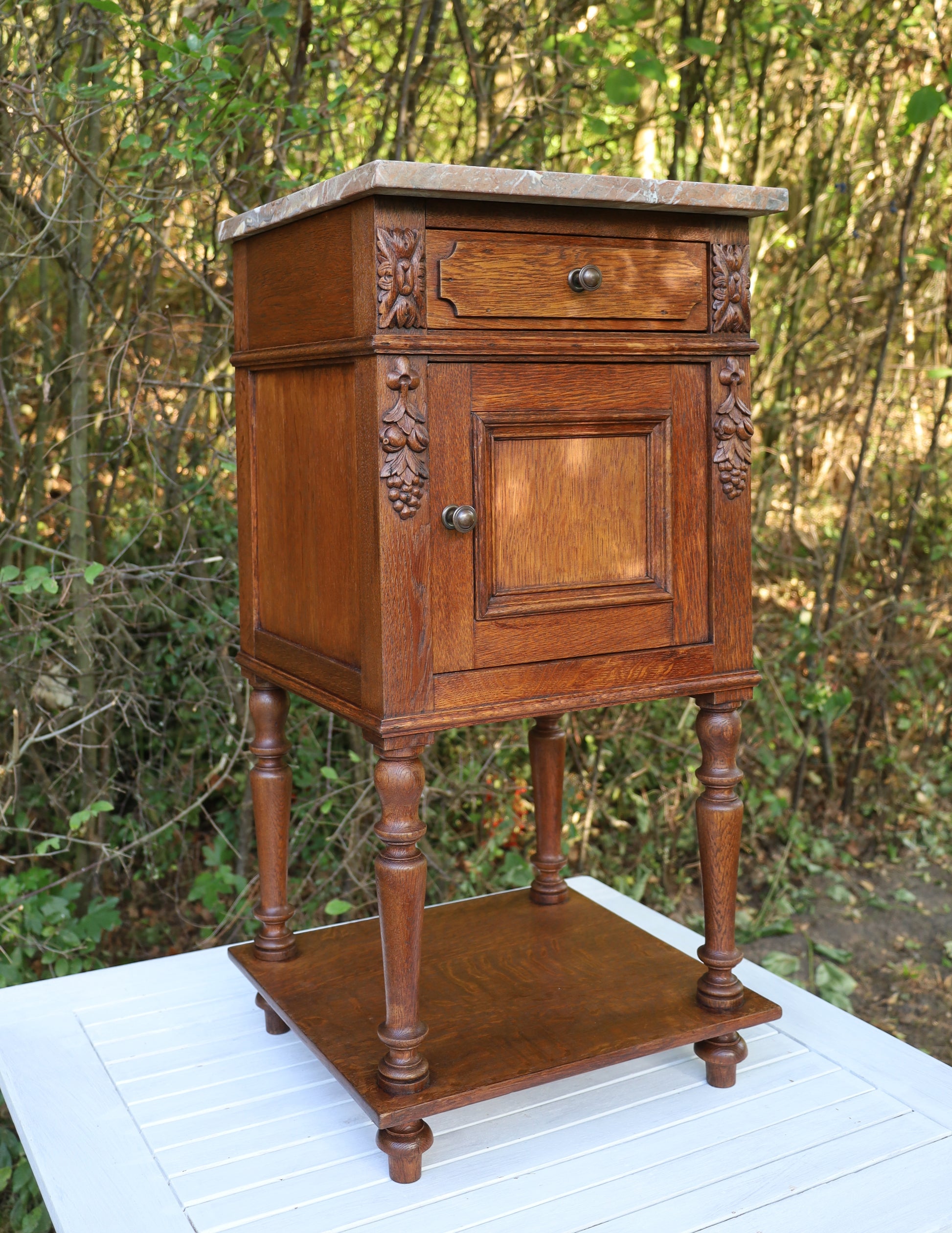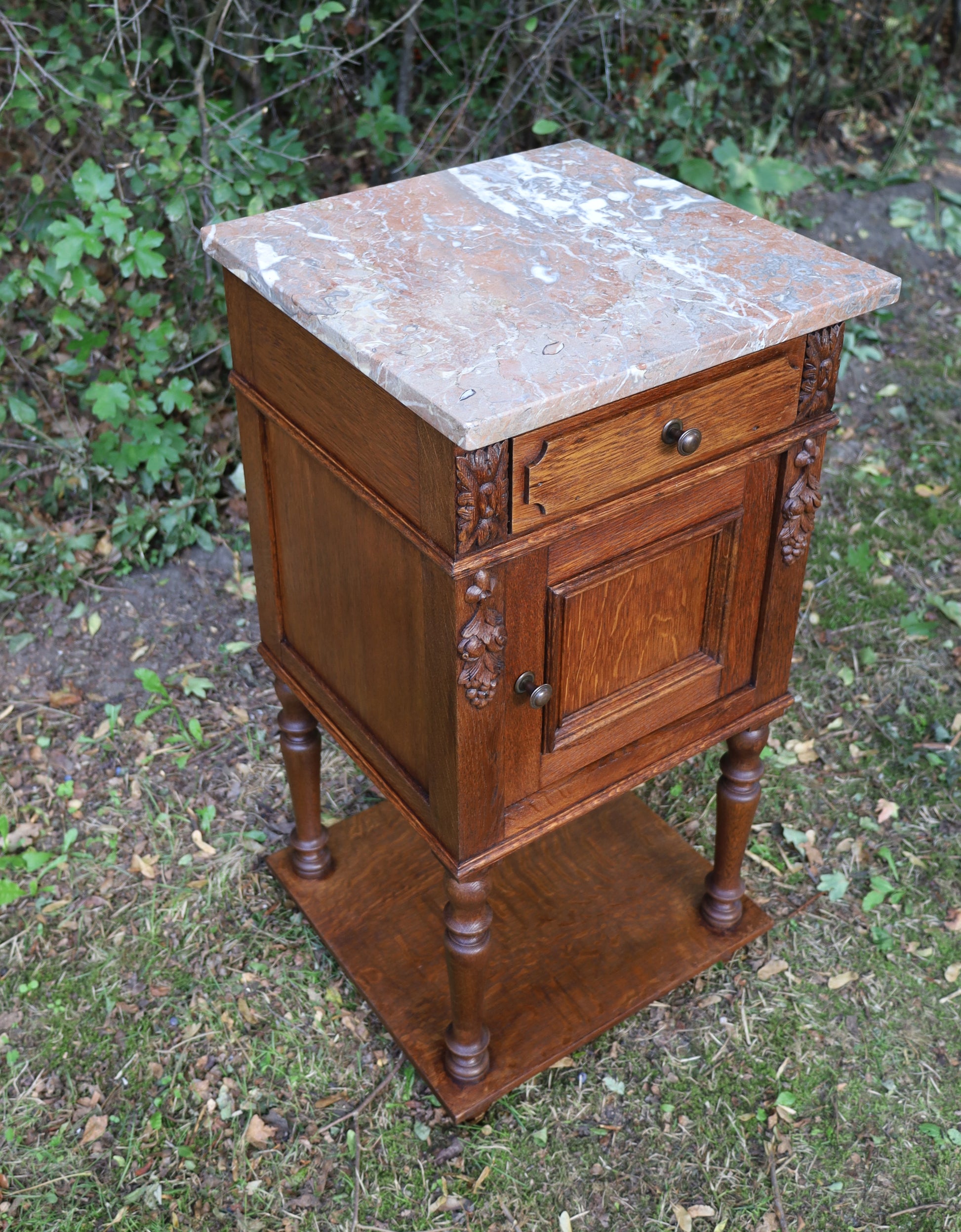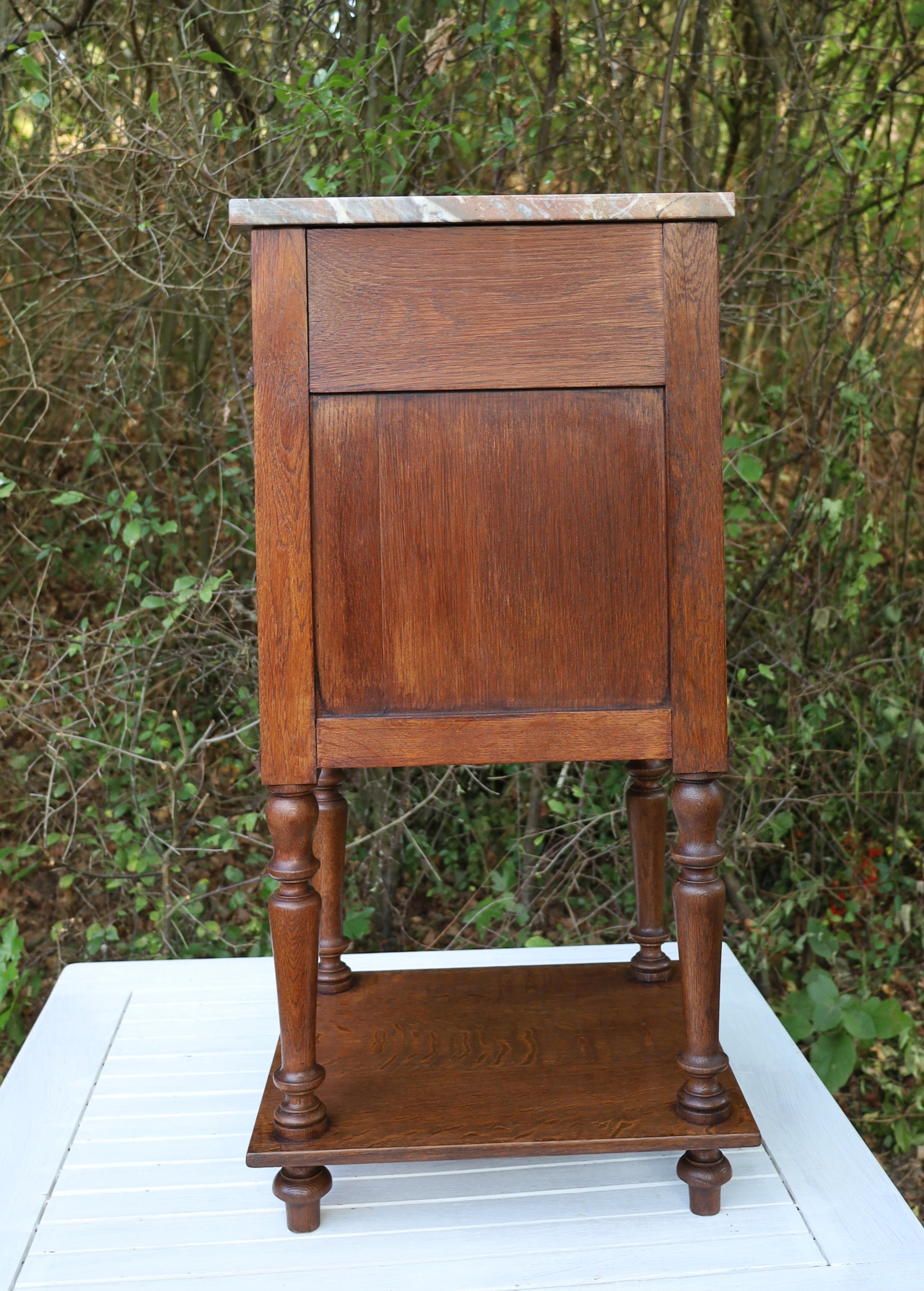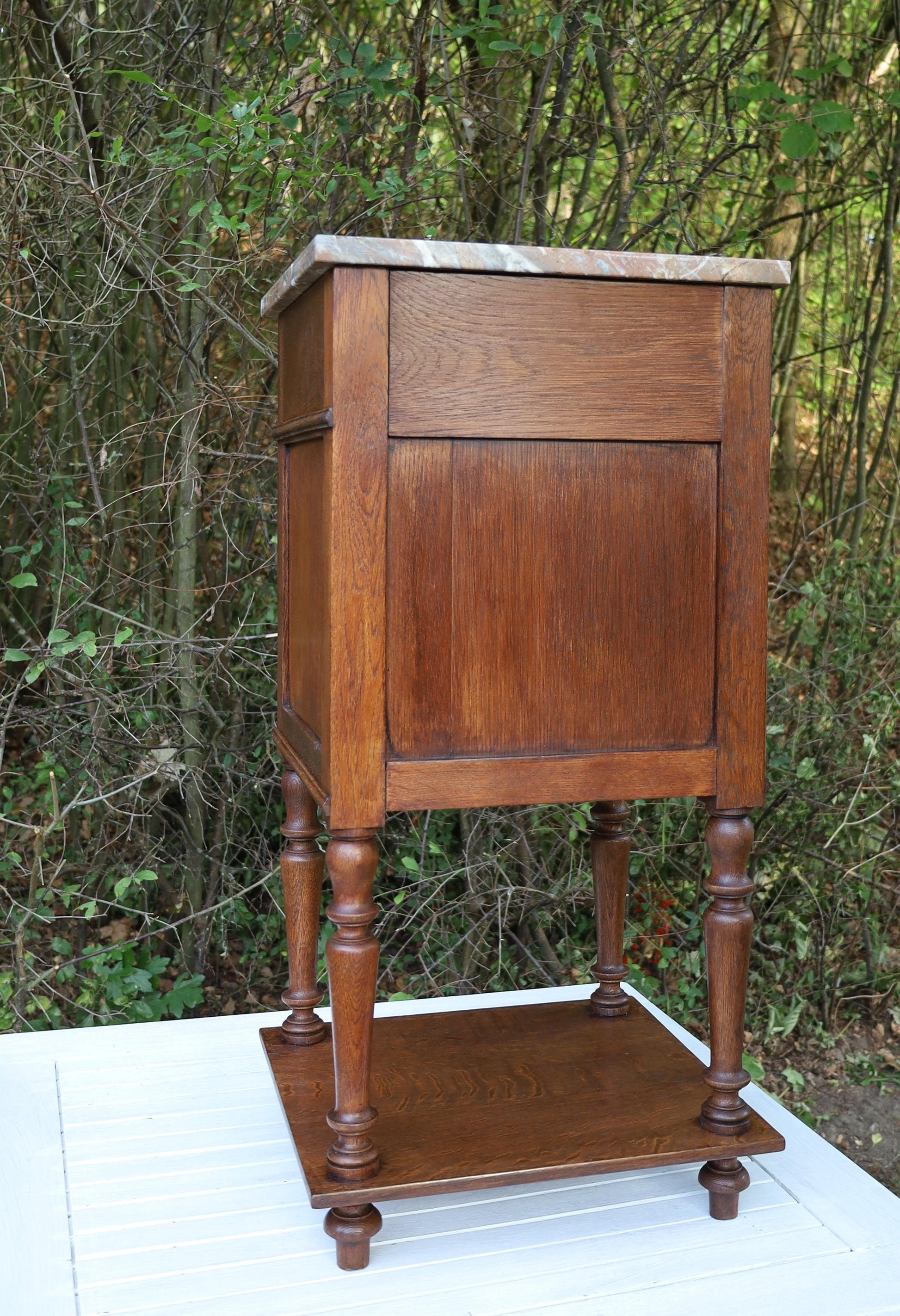Antiker Nachttisch, französisch Ende 19. Jh., aus Eichenholz in Braun mit Marmorplatte
