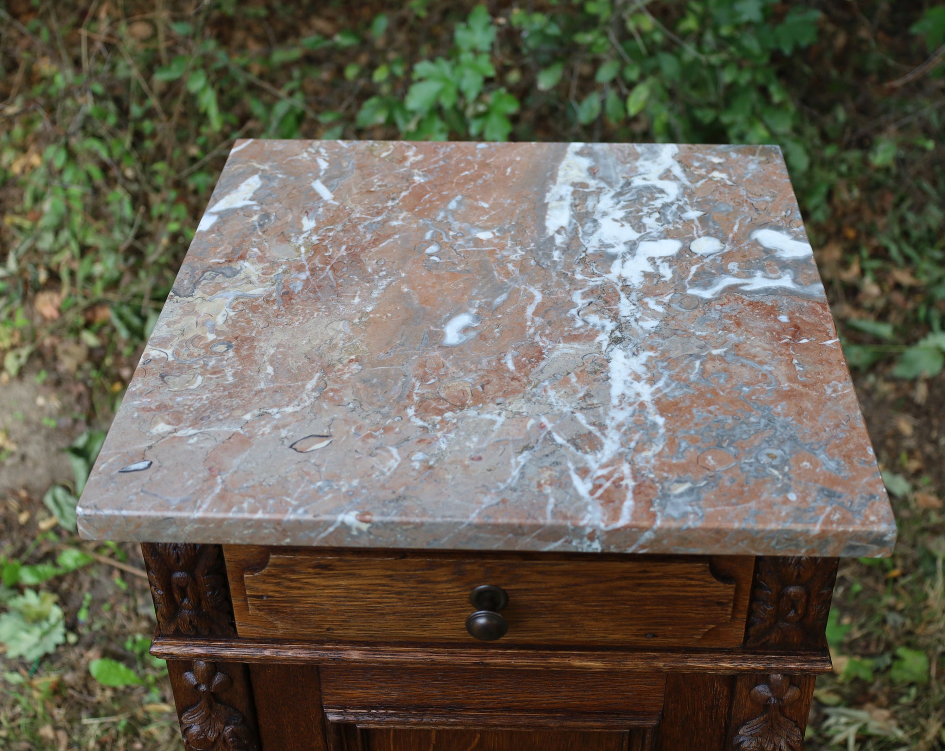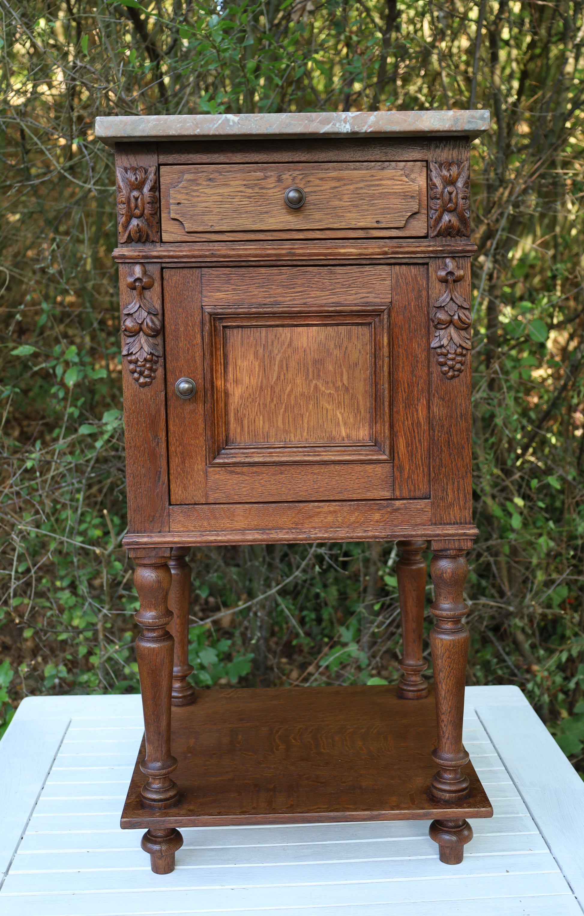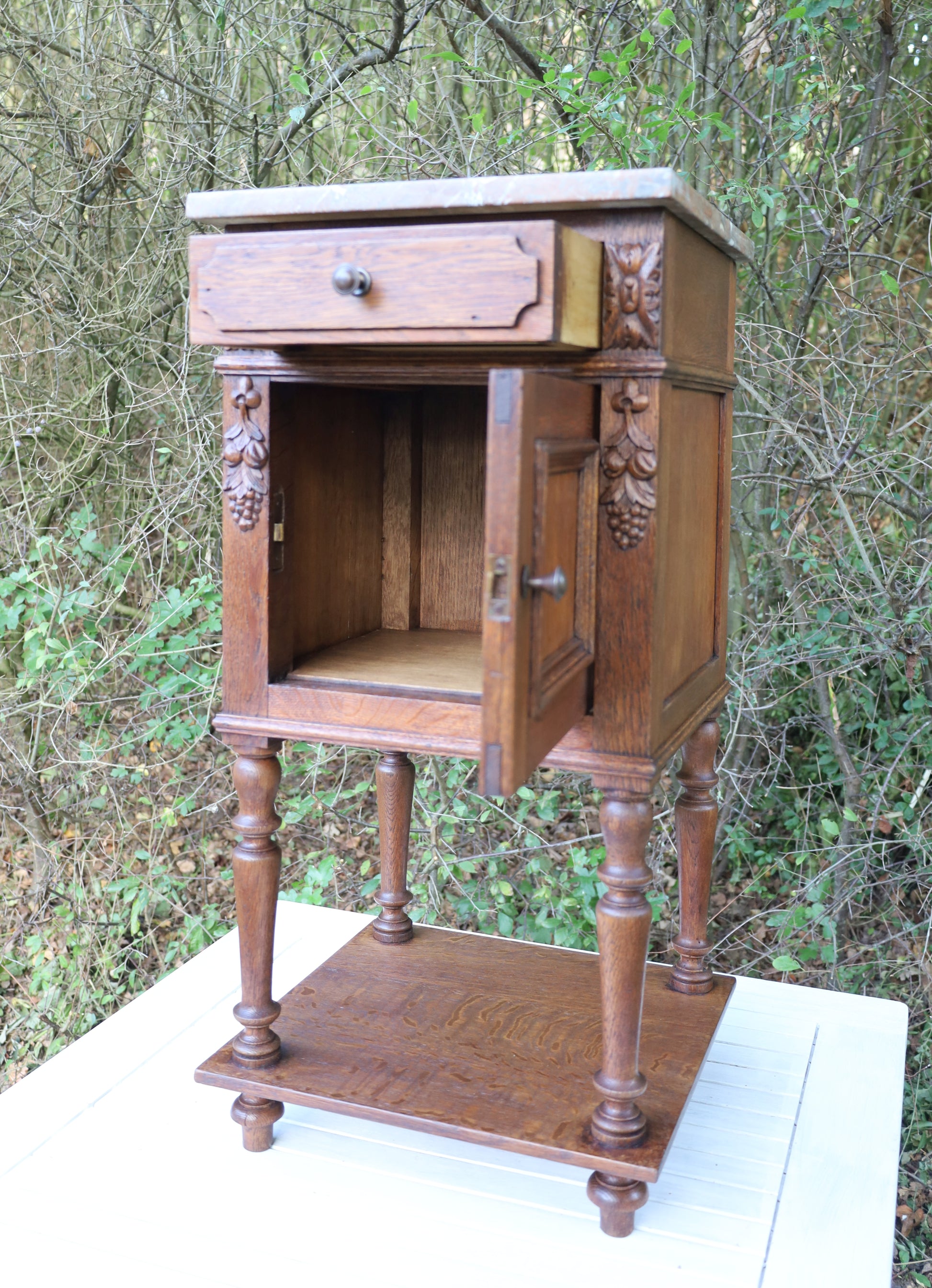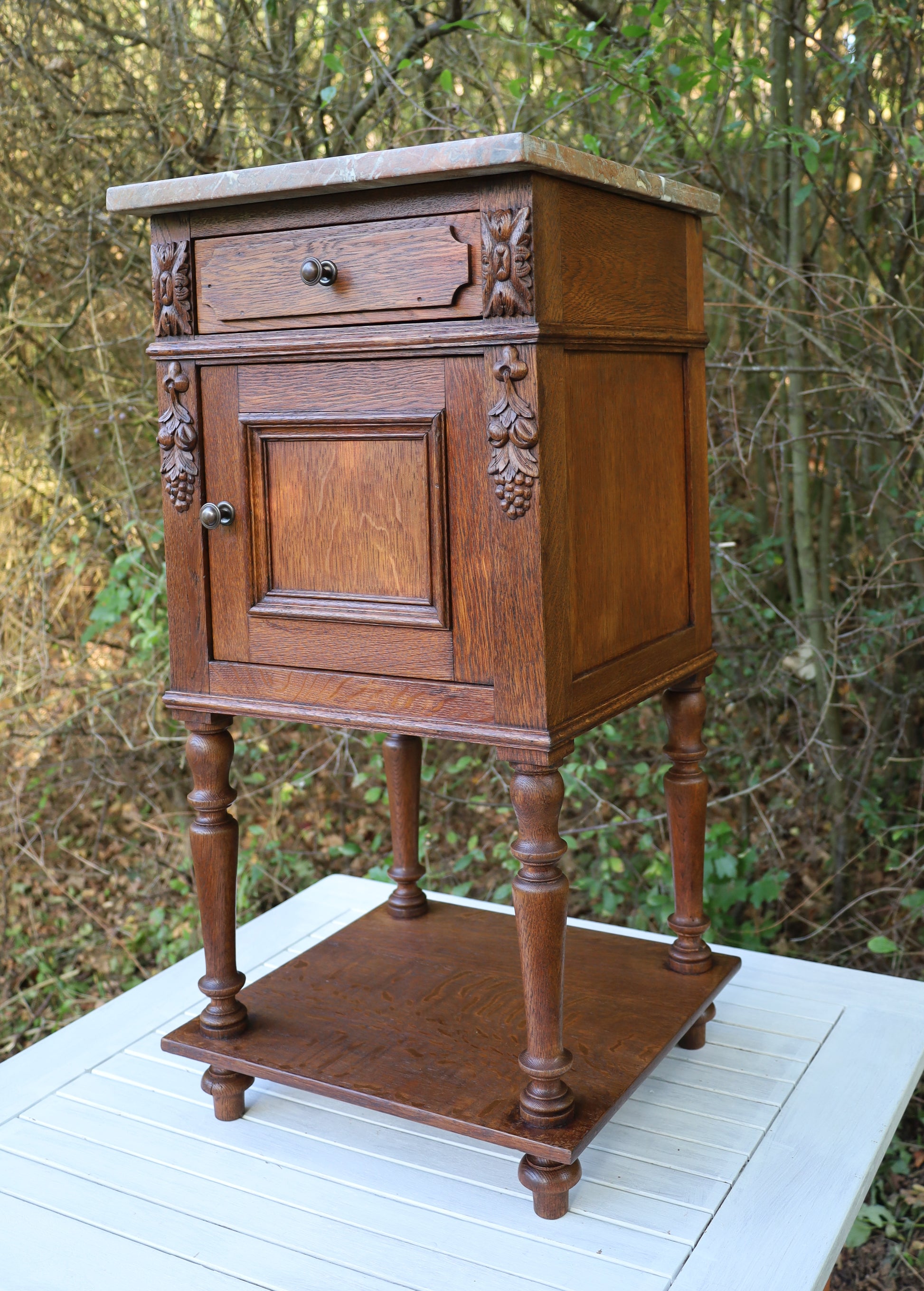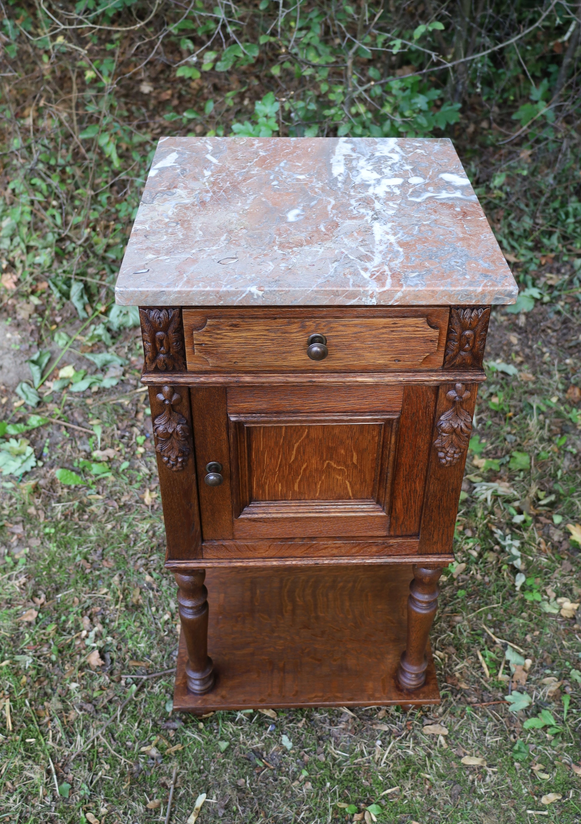 Antiker Nachttisch, französisch Ende 19. Jh., aus Eichenholz in Braun mit Marmorplatte