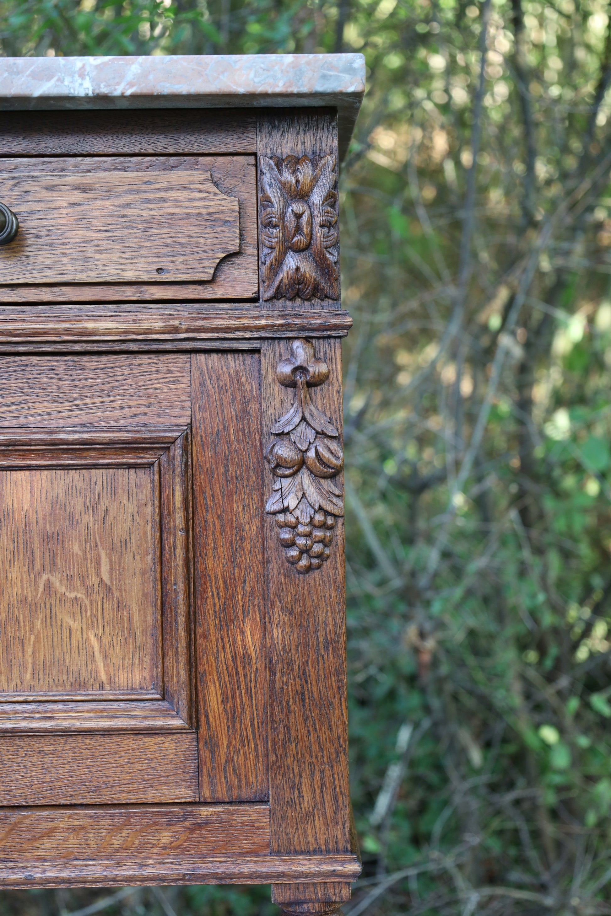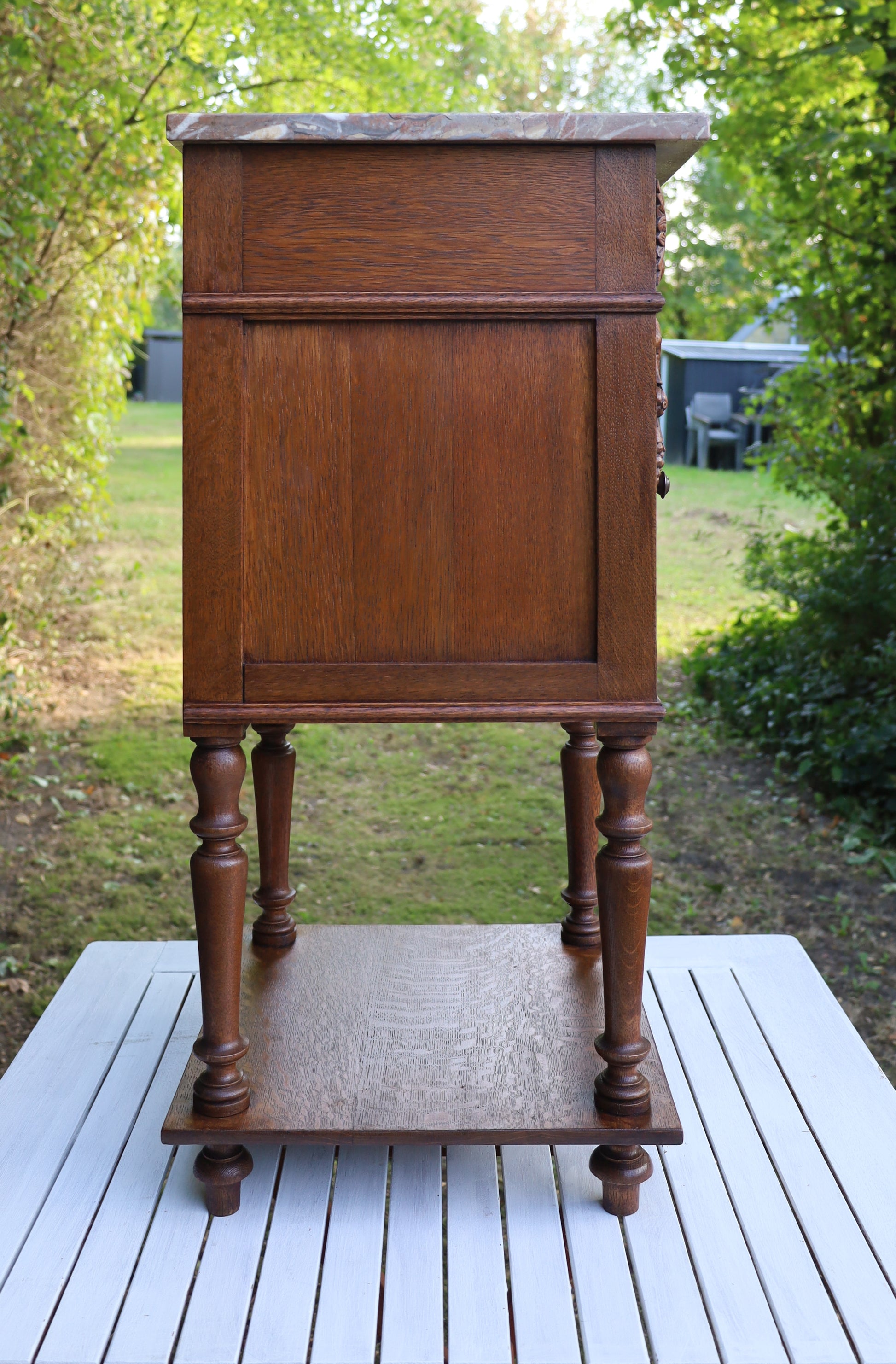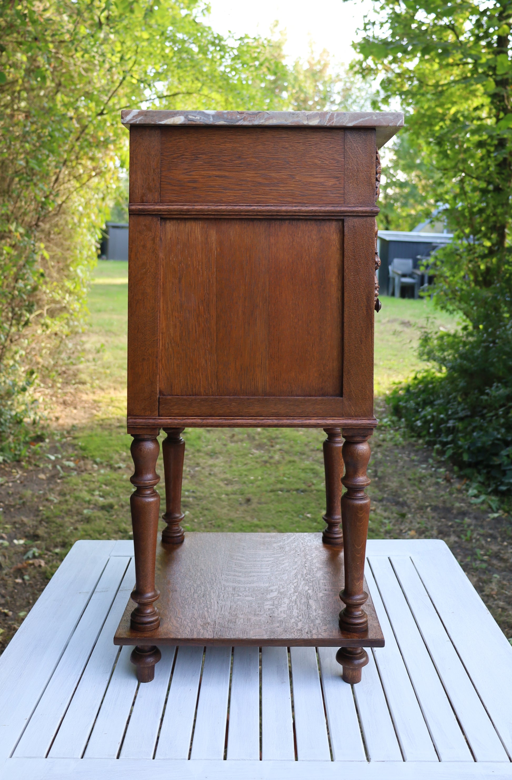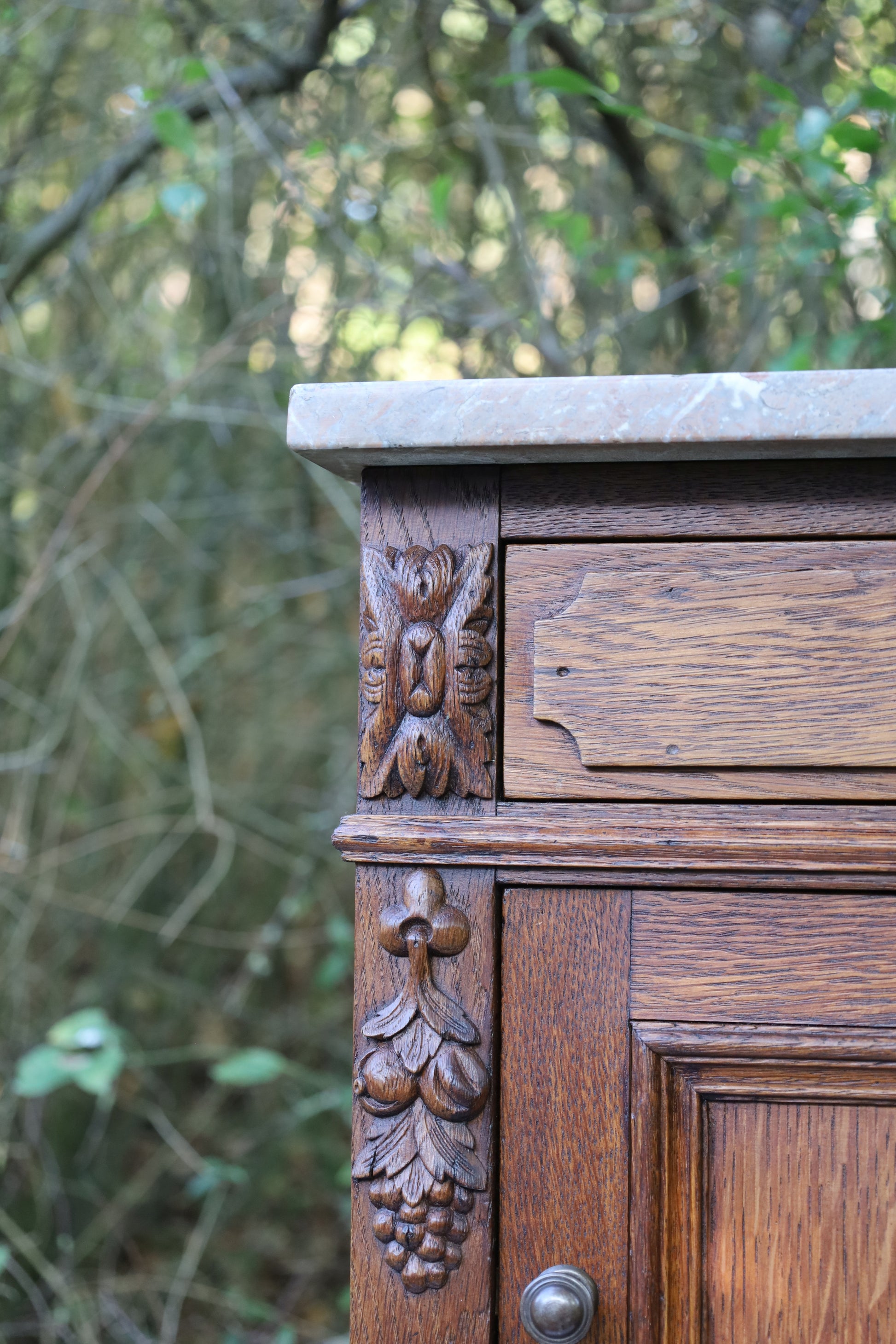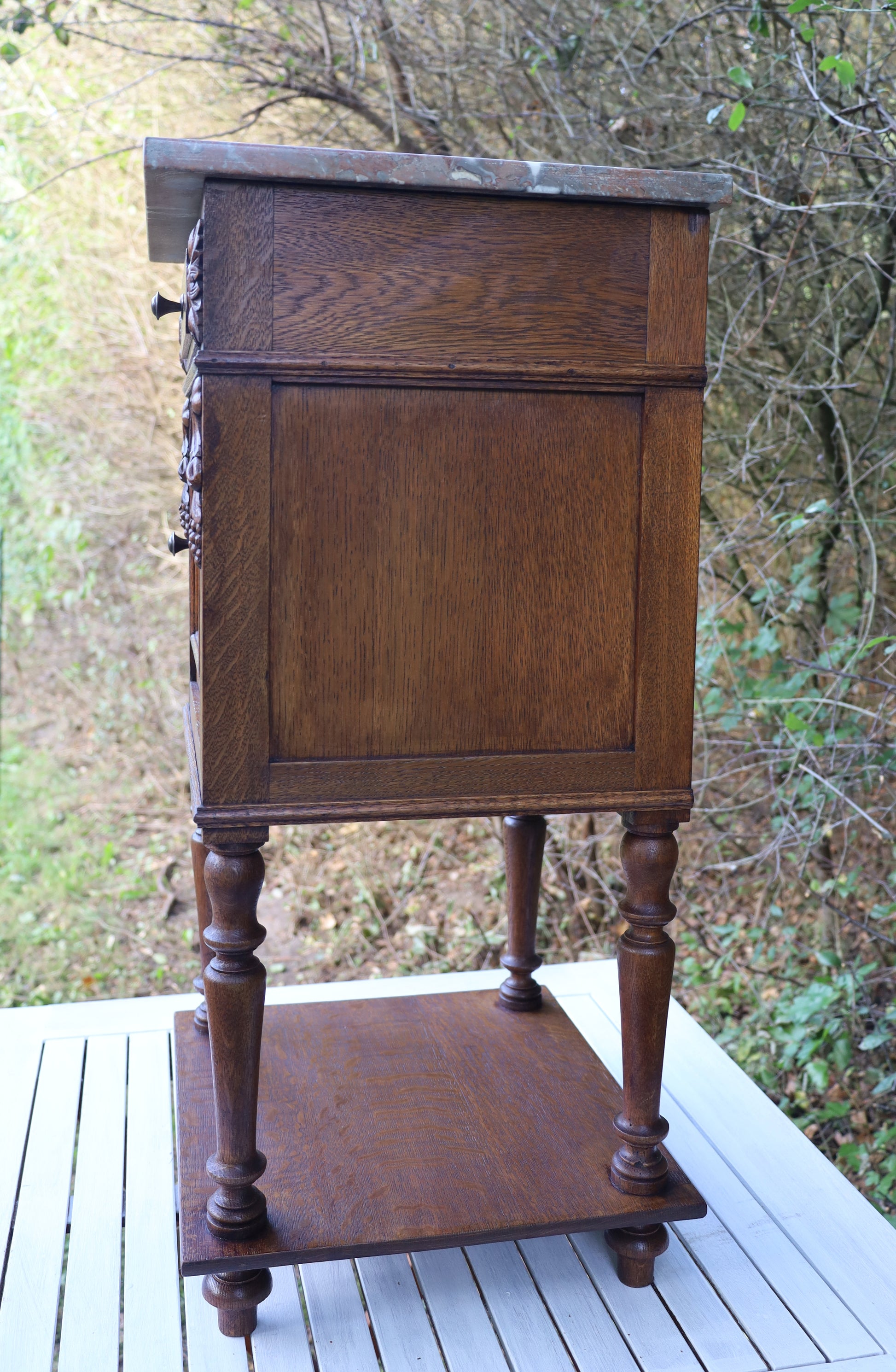 Antiker Nachttisch, französisch Ende 19. Jh., aus Eichenholz in Braun mit Marmorplatte