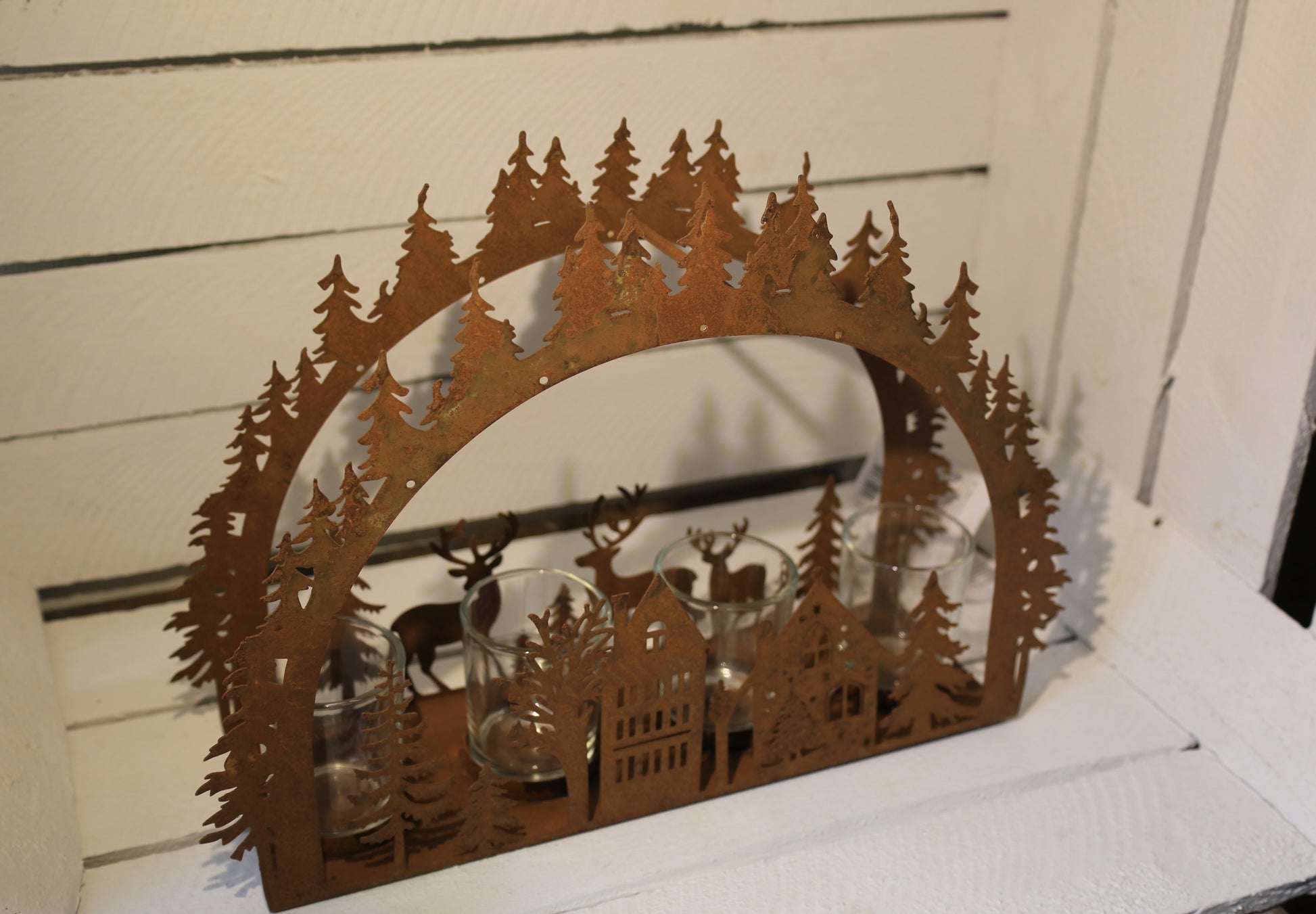 Adventskranz / Teelichthalter in Rostoptik aus Metall, Winterlandschaft